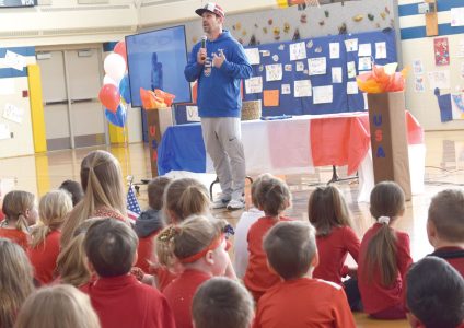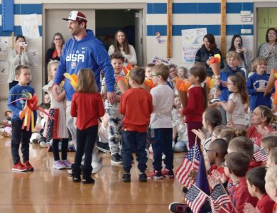 U.S. Olympian snowboarder Nick Baumgartner of Iron River was greeted by students holding paper torches during a visit to Woodland Elementary School in Kingsford on Tuesday. Baumgartner, who won a gold medal at age 40 in the mixed snowboardcross event with partner Lindsey Jacobellis in Beijing, China, talked about the perseverance needed to continue working toward a goal.