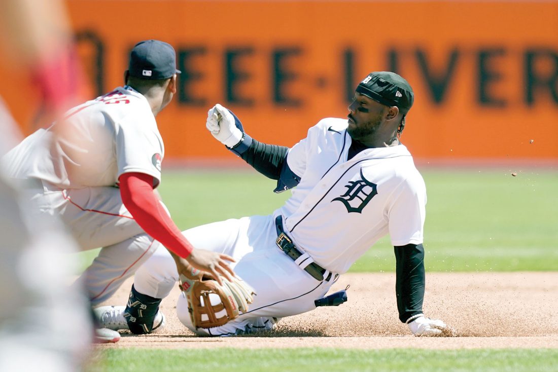 Detroit Tigers center fielder Akil Baddoo safely slides into third ahead of the throw to Boston Red Sox third baseman Rafael Devers during Tuesday’s 5-3 loss in Detroit. (Carlos Osorio/AP photo)