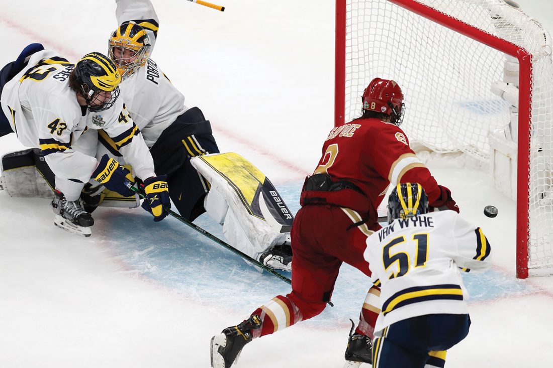 Denver's Carter Savoie (8) scores on Michigan's Erik Portillo (1) in overtime during an NCAA men's Frozen Four semifinal hockey game on Thursday in Boston. With their team knocked out of the tournament, several Wolverines are quickly looking to taking their game to the NHL. (Michael Dwyer/AP photo)