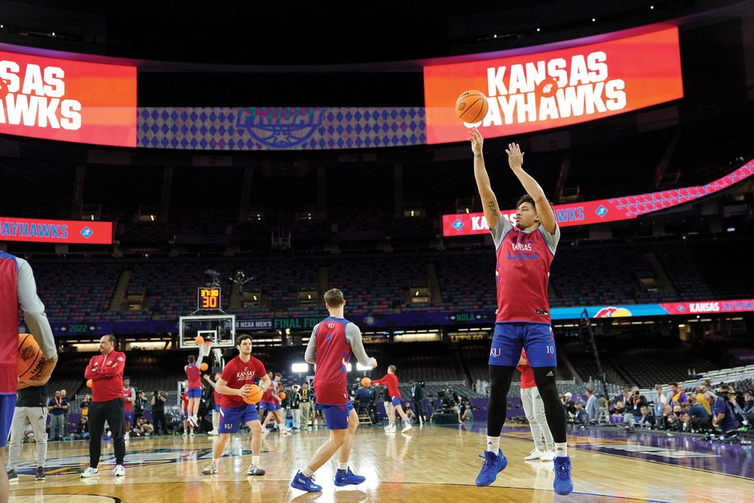 Kansas forward Jalen Wilson shoots during practice for the men's Final Four NCAA college basketball tournament on Friday in New Orleans. Kansas is one of the most experienced teams left in this year’s NCAA men’s tournament, possibly giving them an edge in battling for a national title. (David J. Phillip/AP photo)