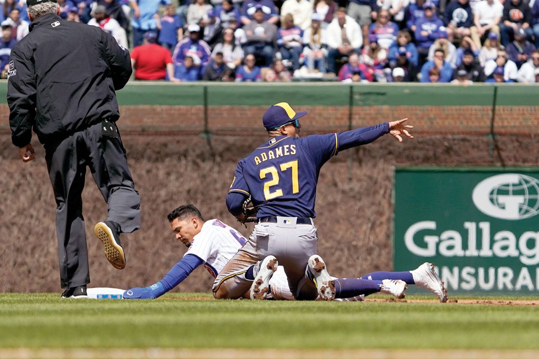 Chicago Cubs' Rafael Ortega (66) is called out at second base on steal attempt by Milwaukee Brewers shortstop Willy Adames (27) during the first inning of a baseball game Sunday, April 10, 2022, in Chicago. (David Banks/AP photo)