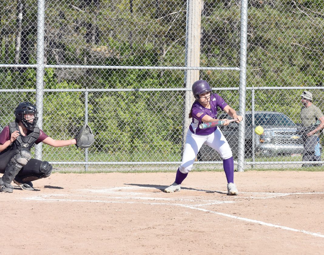 Lady Badger Mallory Sanicki (6) puts down a bunt during the WIAA Division 5 softball regional semifinal in Niagara on Tuesday. Niagara batters had a productive day, with the home team holding a 7-0 advantage at one point of the girls varsity softball clash. (Dennis Mansfield/Daily News photo)