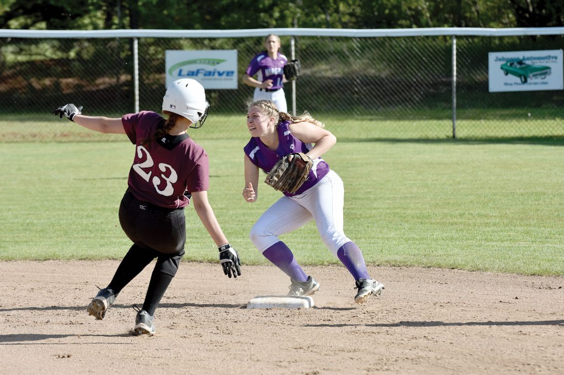 Niagara infielder Lillian Loukus rushes over to get in position to receive a throw and potentially cut down a Blazer baserunner in the Lady Badgers’ 10-3 win over Green Bay N.E.W. Lutheran/Providence on Tuesday in Niagara. (Dennis Mansfield/Daily News photo)