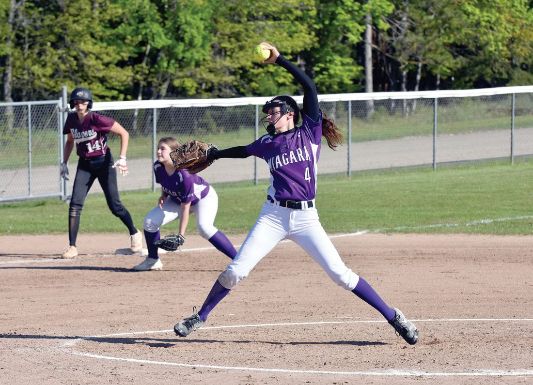 - Niagara starting pitcher Abigail Wells (4) winds up to let loose an offering during the Lady Badgers’ 10-3 girls varsity softball win over Green Bay N.E.W. Lutheran/Providence in the WIAA Division 5 softball regional semifinal in Niagara on Tuesday afternoon. (Dennis Mansfield/Daily News photo)