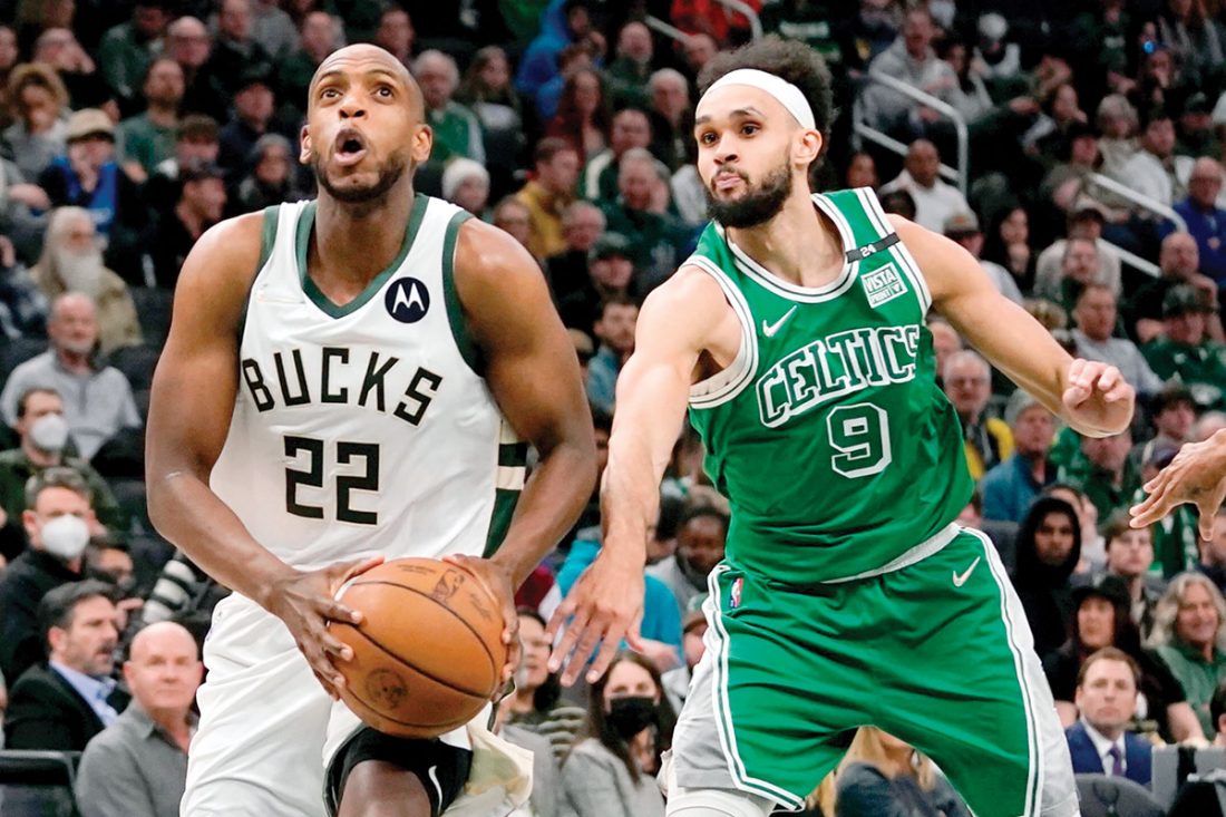 Milwaukee Bucks forward Khris Middleton (22), who hasn’t played since injuring his left knee in Game 2 of the team’s first-round series with Chicago, is expected to miss at least two more games against the Boston Celtics. The second-round matchup is currently knotted at 1-1. (AP photo)