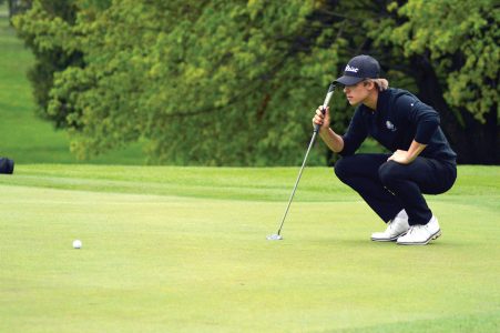 Kingsford’s Cole Myllyla lines a putt during the final 18-hole Great Northern Conference match of the 2022 season at the Escanaba Country Club on Thursday. In the boys division, Myllyla played his way to first-team all-conference honors while fellow Flivver Lance Harry was named to the second-team all-conference. (Todd Rose/Daily Press photo)