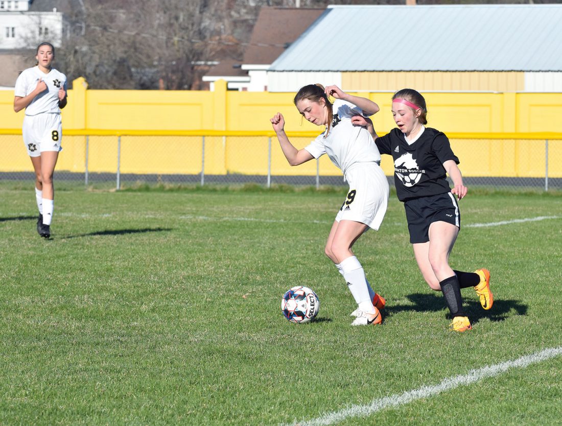 A Houghton player steps up and cuts off Mountaineer senior Gabby Carey (13), who constantly looked to push the ball into the Houghton defensive zone during Friday’s soccer clash. (Dennis Mansfield/Daily News photo)