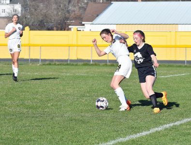 - A Houghton player steps up and cuts off Mountaineer senior Gabby Carey (13), who constantly looked to push the ball into the Houghton defensive zone during Friday’s soccer clash. (Dennis Mansfield/Daily News photo)