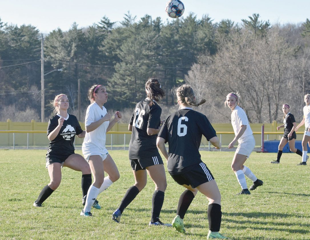 - Iron Mountain junior Aziza Burgoon (5) is surrounded as she attempts to go up and control a ball during the Mountaineers’ girls varsity soccer contest with visiting Houghton on Friday afternoon. The Mountaineers were able to hold off the Gremlins for a 1-0 victory in front of the home fans. (Dennis Mansfield/Daily News photo)