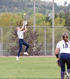 Norway left fielder Emma Dube (13) tracks down a drive by an Escanaba slugger in the first game of a varsity softball twinbill on the Knights’ home diamond Thursday afternoon. Dube make a specular play, as the ball first glanced off her glove. But the outfielder kept her eye on the ball and gathered it in for the out, as shortstop Hannah Burklund (13) looked on. (Dennis Mansfield/Daily News photo)