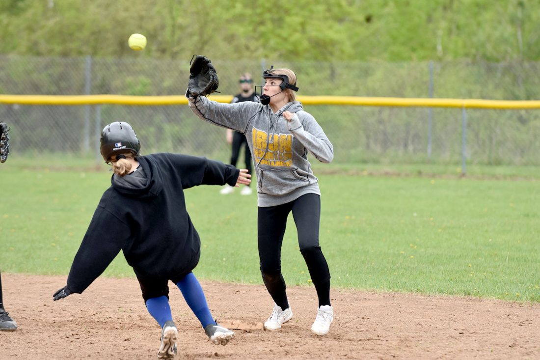 - Iron Mountain second baseman Macy Linsenbigler looks to take a throw and tag out an Ishpeming runner during Game 2 of a girls varsity softball doubleheader Thursday afternoon. (Dennis Mansfield/Daily News photo)