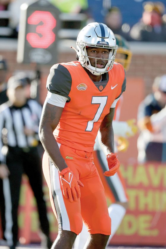 Nevada wide receiver Romeo Doubs (7) lines up for the National Team during the Reese’s Senior Bowl on Feb. 5 in Mobile, Ala. (Butch Dill/AP photo)