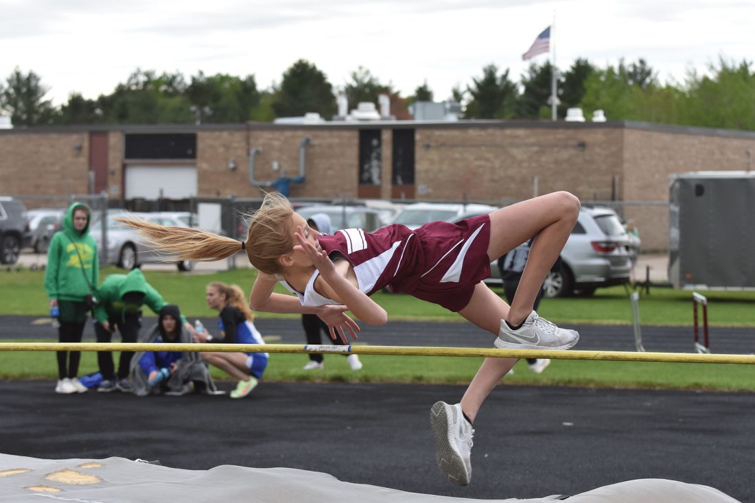 - North Dickinson’s Aubrey Applekamp launches herself to a second-place finish in the high jump at Friday’s MHSAA Division 3, Region 48 invitational. (Dennis Mansfield/Daily News photo)
