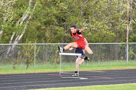 North Central’s Trenton Naser shows off his winning form during the 300-meter hurdles at the MHSAA Division 3, Region 48 track and field invitational at North Dickinson County High School on Friday. (Dennis Mansfield/Daily News photo)