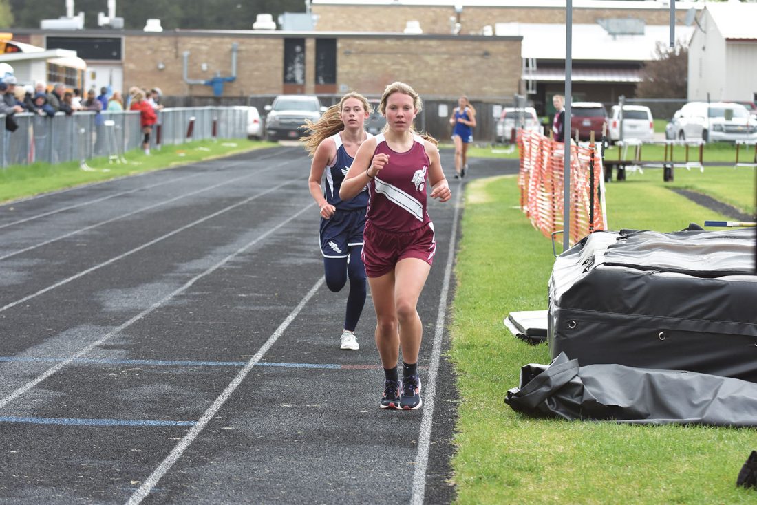 Norway’s Taylor Adams tries to keep pace with North Dickinson’s Mya Grundlund, front, who won the 3200-meter run at the Region 48 track and field invitational Friday in a time of 14 minutes, 3.03 seconds. (Dennis Mansfield/Daily News photo)