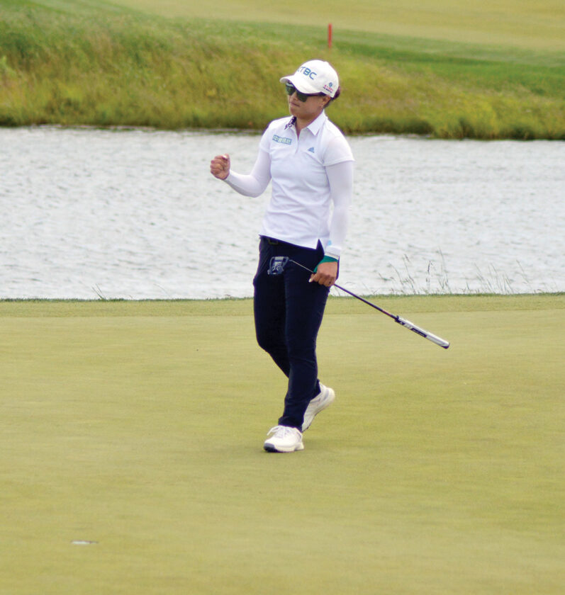 Ssu-Chia Cheng pumps celebrates a birdie putt on the ninth hole of the Sweetgrass Golf Course on Sunday during the Epson Tour Island Resort Championship in Harris. (Todd Rose/Daily Press photo)