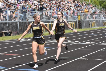 - Iron Mountain’s Emma Ellis takes the baton from teammate Chloe Maycroft during a relay event at the U.P. Track and Field Finals hosted by Kingsford High School on Saturday. (Dennis Mansfield/Daily News photo)