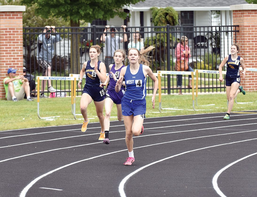 West Iron County sprinter Danica Shamion, front center, takes the lead in a heat of the Division 2 200-meter dash on Saturday at the U.P Track and Field Finals hosted by Kingsford High School. (Dennis Mansfield/Daily News photo)