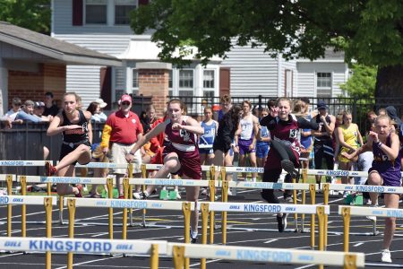 - North Dickinson track and field teammates Micah Lindholm and Chrislyn Inglese compete in the 100-meter hurdles at Saturday’s U.P. Finals. Nearly 800 student-athletes from around the U.P. competed at the event held at Kingsford High School. (Dennis Mansfield/Daily News photo)