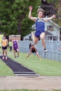 - Kingsford’s Cole Myllyla takes flight, almost literally, in an attempt in the long jump at his home field Saturday. (Dennis Mansfield/Daily News photo)