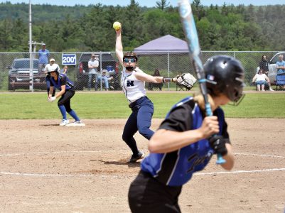 Norway starting pitcher Kali Stanchina (26) winds up to battle an Ishpeming hitter. After a sterling performance in the semifinal against the Hematites, Stanchina and her teammates struggled against the Panthers. For complete coverage, see Tuesday’s edition of The Daily News. (Dennis Mansfield/Daily News photo)