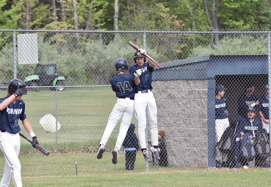 - Norway sluggers Landon Amundson (14) and Michael Peterson (17) jump and bump in celebration of Amundson crossing the plate for Norway’s only run against North Central in the district semifinal clash Friday morning. The run was enough to beat the Jets and advance to the tournament finals, where they also played Bark River-Harris. (Dennis Mansfield/Daily News photo)