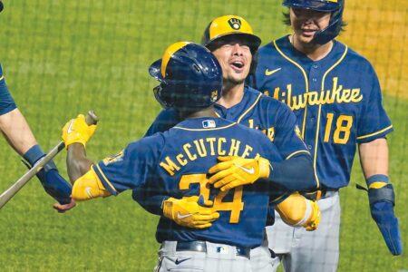 Milwaukee Brewers slugger Willy Adames celebrates with Andrew McCutchen (24) as he returns to the dugout after hitting a grand slam off Pittsburgh Pirates reliever Cam Vieaux in the eighth inning of Friday’s game in Pittsburgh. (Gene J. Puskar/AP photo)