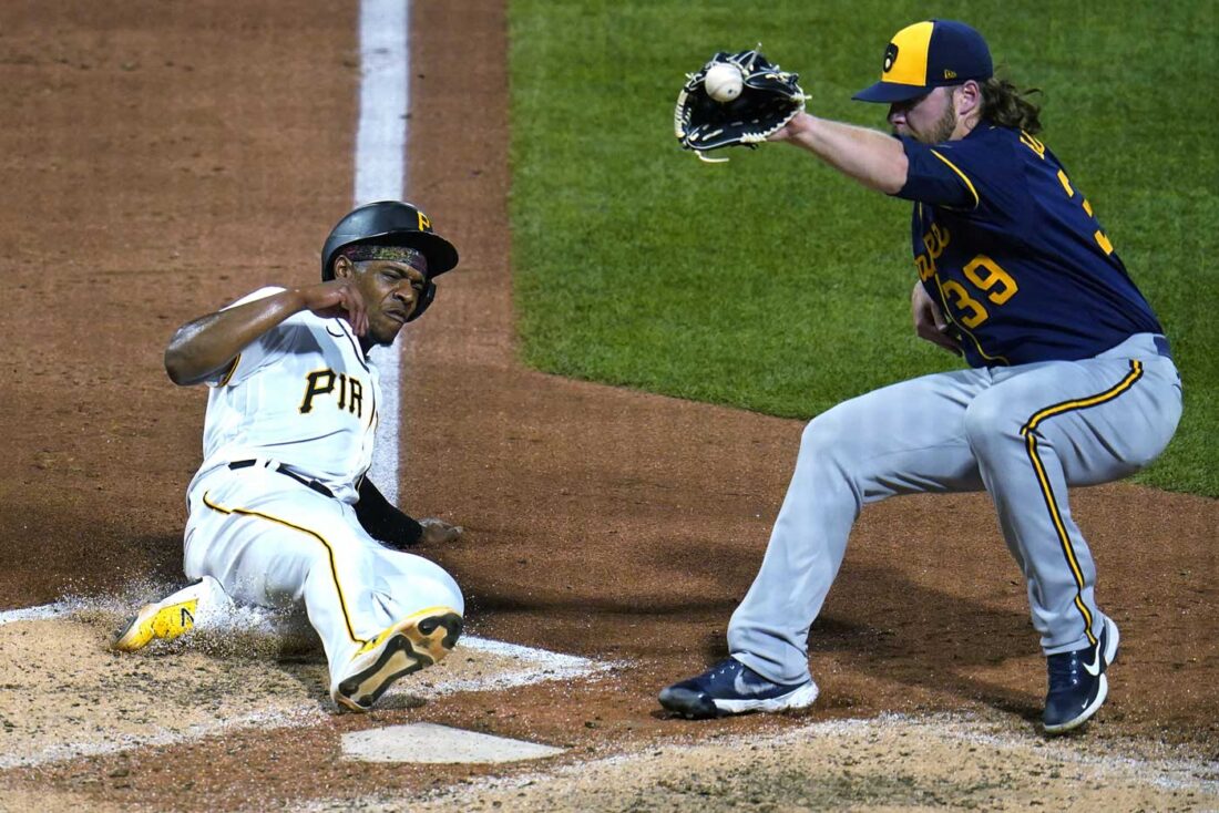 Milwaukee Brewers starting pitcher Corbin Burnes (39) takes the throw from catcher Omar Narvaez as Pittsburgh Pirates' Ke'Bryan Hayes scores from third on a wild pitch during the sixth inning of a baseball game in Pittsburgh on Friday. (Gene J. Puskar/AP photo)