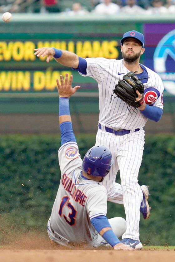 Chicago Cubs second baseman David Bote throws out New York Mets' J.D. Davis after forcing out Luis Guillorme at second during the ninth inning of Sunday’s game in Chicago. (Nam Y. Huh/AP photo)