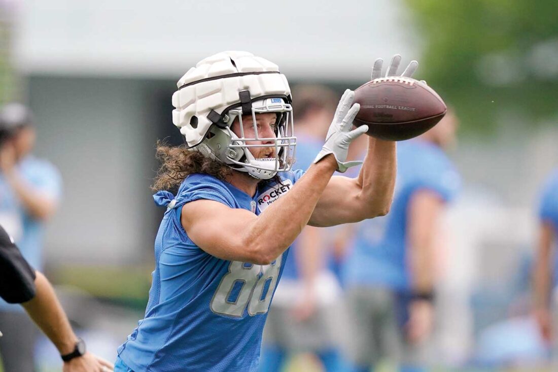 Detroit Lions tight end T.J. Hockenson catches during drills at the Lions NFL football practice facility Wednesday in Allen Park, Mich. The Lions are hoping additions to the team’s receiving corps will help Hockenson be more productive in the upcoming season. (Carlos Osorio/AP photo)