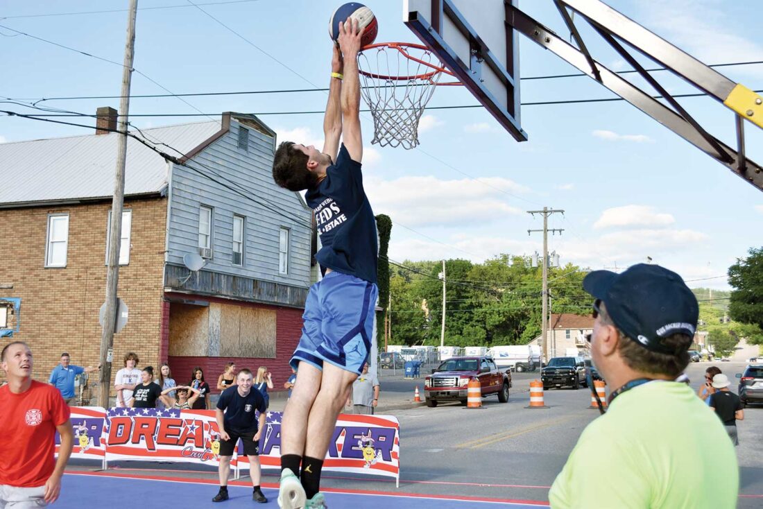 The fun and festivities of the Gus Macker Basketball Tournament in Iron Mountain officially got underway Friday with the Friday Nite Challenge, which included games between Leeds Real Estate and Stephens Reality, and then area police departments versus local firefighters on the Main Court on Carpenter Avenue. Pictured: Hunter Mattson of the Dickinson County Sheriff’s Department is all smiles while watching law enforcement teammate Kaden Schuls of the Florence County Sheriff’s Department sky and dunk the ball in the police departments’ victory. The Gus Macker tournament is slated to continue through Sunday.