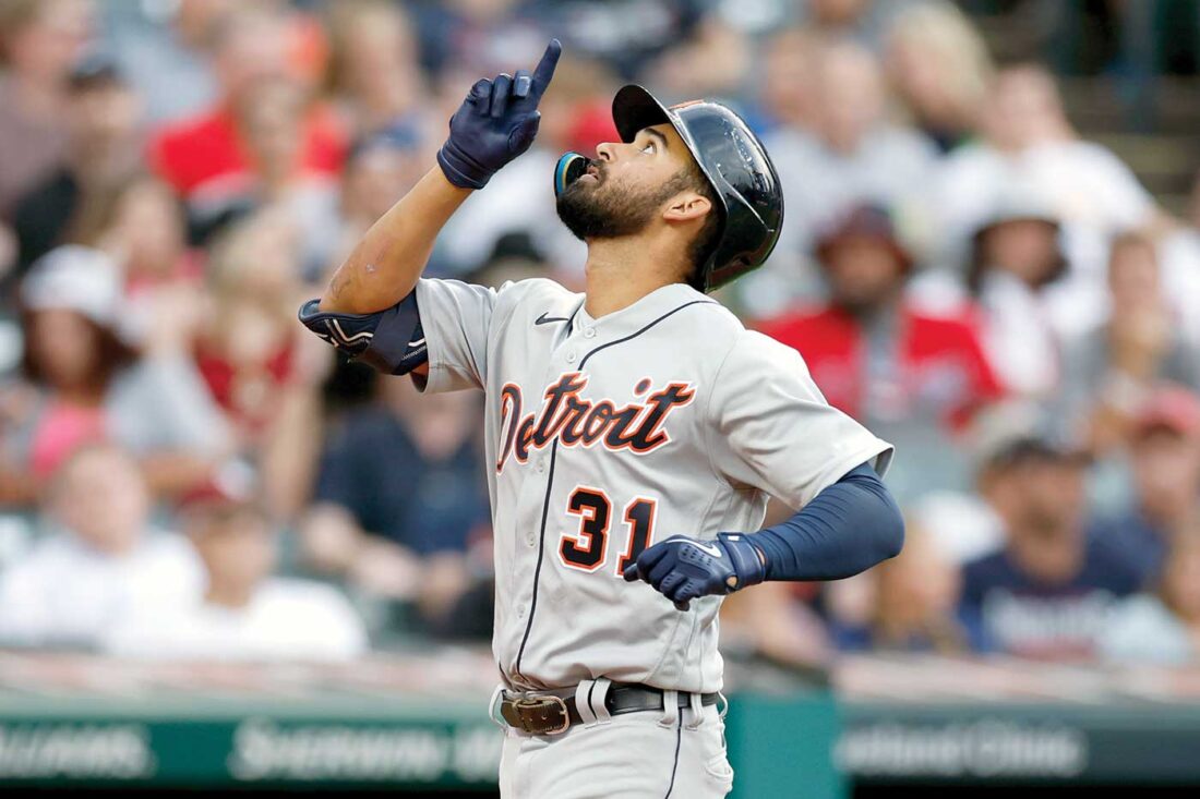 Detroit Tigers outfielder Riley Greene celebrates after hitting a solo home run off Cleveland Guardians starting pitcher Zach Plesac during the third inning of Friday night’s game in Cleveland. (Ron Schwane/AP photo)