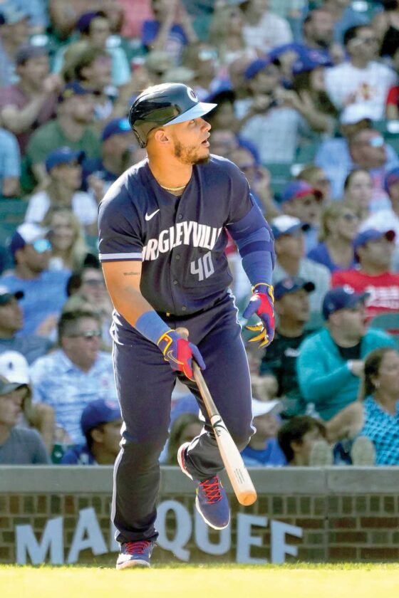Chicago Cubs slugger Willson Contreras watches his two-run home run off Miami Marlins relief pitcher Dylan Floro during the eighth inning of Friday’s game in Chicago. The Cubs won 2-1. (Charles Rex Arbogast/AP photo)