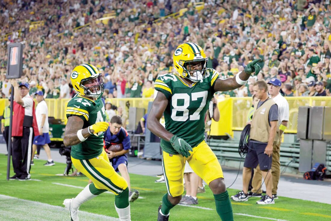 Green Bay Packers wide receiver Romeo Doubs (87) and tight end Alize Mack (47) celebrate a touchdown against the New Orleans Saints during a preseason NFL football game Aug. 19 in Green Bay, Wis. Doubs is one of three rookie receivers selected by the Packers in the 2022 NFL Draft to help fill the void after all-pro wideout Davante Adams was traded to the Las Vegas Raiders. (Matt Ludtke/AP photo)