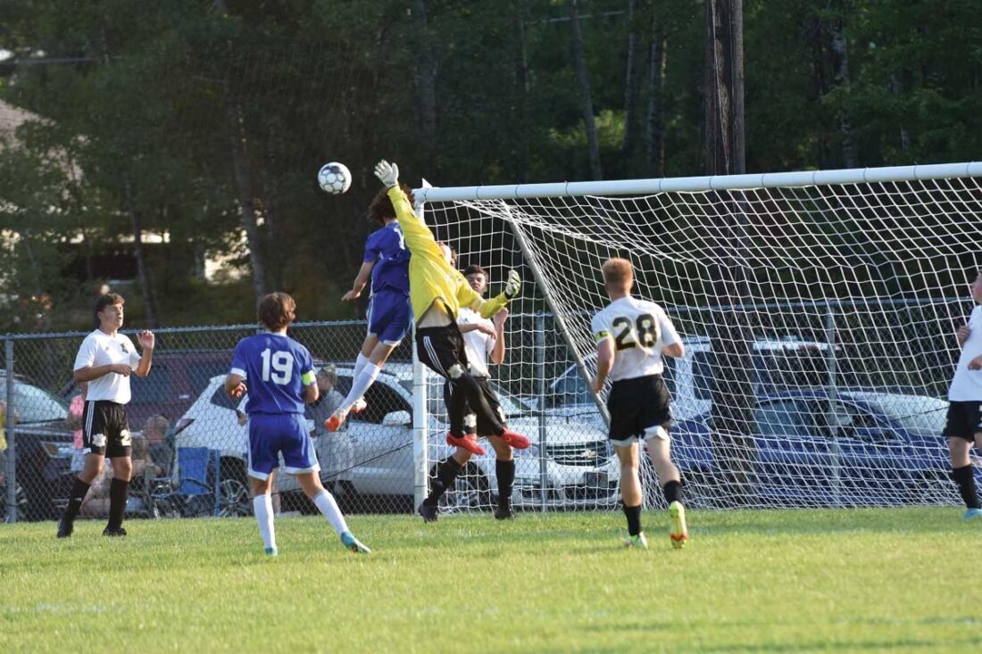 (Dennis Mansfield/Daily News photo) Kingsford’s Lucas Engman (1) tries to get in behind Iron Mountain goalie Tyler Winch (1) and head in a corner kick during Tuesday’s clash at Commemorative Field in Kingsford.