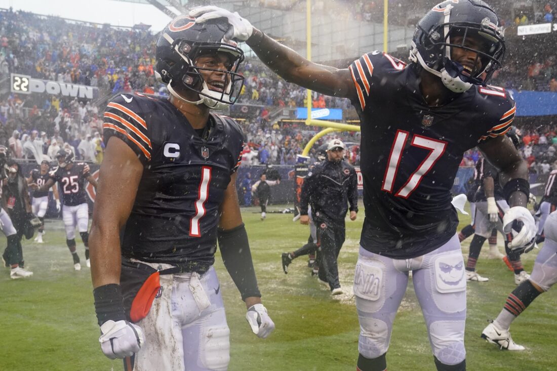 - Chicago Bears’ Justin Fields and Ihmir Smith-Marsette celebrate after an NFL football game against the San Francisco 49ers Sunday, Sept. 11, 2022, in Chicago. The Bears won 19-10. (AP Photo/Nam Y. Huh)