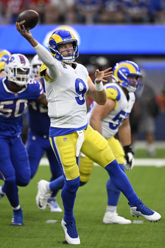 Los Angeles Rams quarterback Matthew Stafford (9) passes during the first half of an NFL football game against the Buffalo Bills on Thursday night in Inglewood, Calif. (Denis Poroy/AP photo)