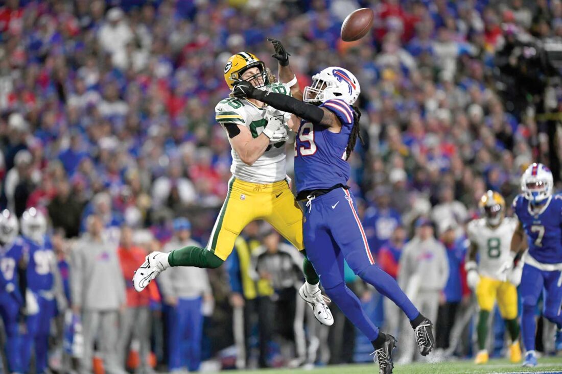 Buffalo Bills linebacker Tremaine Edmunds (49) breaks up a pass intended for Green Bay Packers tight end Robert Tonyan (85) during the second half of Sunday night’s NFL contest in Orchard Park. The Bills (6-1) handed the visiting Packers (3-5) their fourth consecutive loss 27-17. (Jeffrey T. Barnes/AP photo)