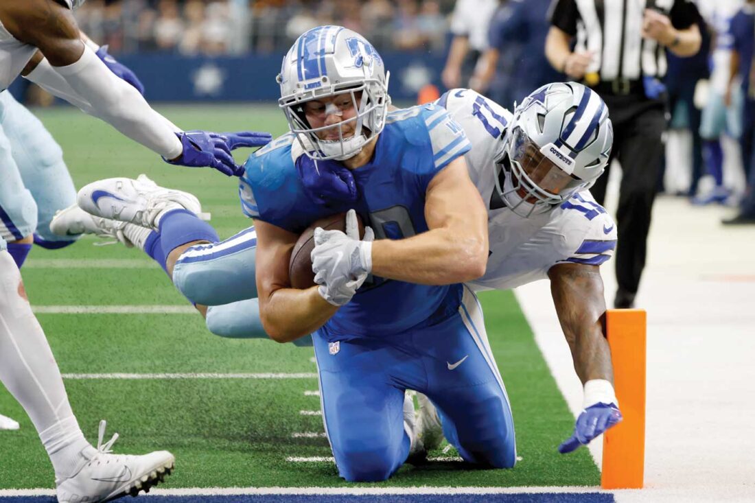 Detroit Lions tight end Brock Wright (89) is tackled at the 1-yard line by Dallas Cowboys linebacker Micah Parsons (11) during the second half of Sunday’s game in Arlington, Texas. (Ron Jenkins/AP photo)