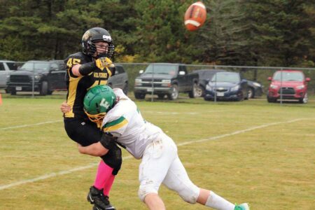 And, in a unique moment, Niagara offensive lineman Anthony Phillips recovered a fumble in the endzone resulting in a touchdown. In the first half, Niagara’s Braydin Pearce was seemingly headed to endzone for a long TD run before he was caught by a Patriot defender inside the 10-yard line and fumbled. The ball rolled into the endzone, where Phillips beat a Goodman-Pembine player to the ball and pounced on it for a touchdown.