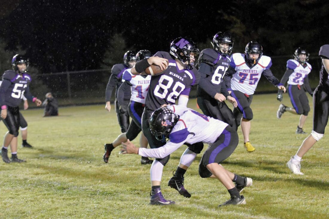 - Niagara’s Logan Weber (88) can’t slip the grasp of Goodman-Pembine defender Ryan Erickson (4) during Thursday night’s 8-player football clash at Niagara High School. (Dennis Mansfield/Daily News photo)