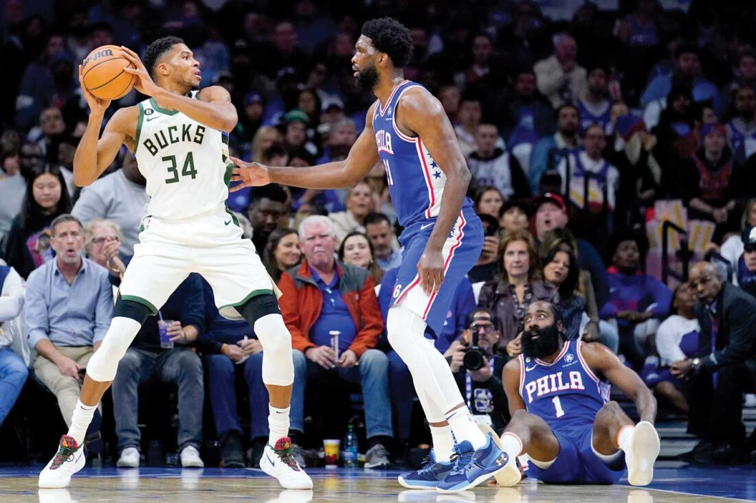 Milwaukee Bucks star forward Giannis Antetokounmpo (34) tries to get around Philadelphia 76ers center Joel Embiid (21) during the first half of Thursday night’s NBA basketball game in Philadelphia. (Matt Slocum/AP photo)