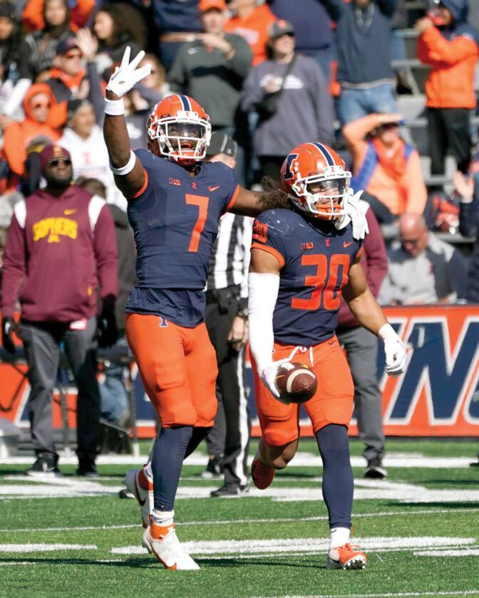 - Illinois defensive back Kendall Smith (7) celebrates with teammate Sydney Brown (30) after Brown’s interception against Minnesota on Oct. 15 in Champaign, Ill. The surprising Illini have the top-ranked defensive unit in the nation, followed by Ohio State. (Charles Rex Arbogast/AP photo)