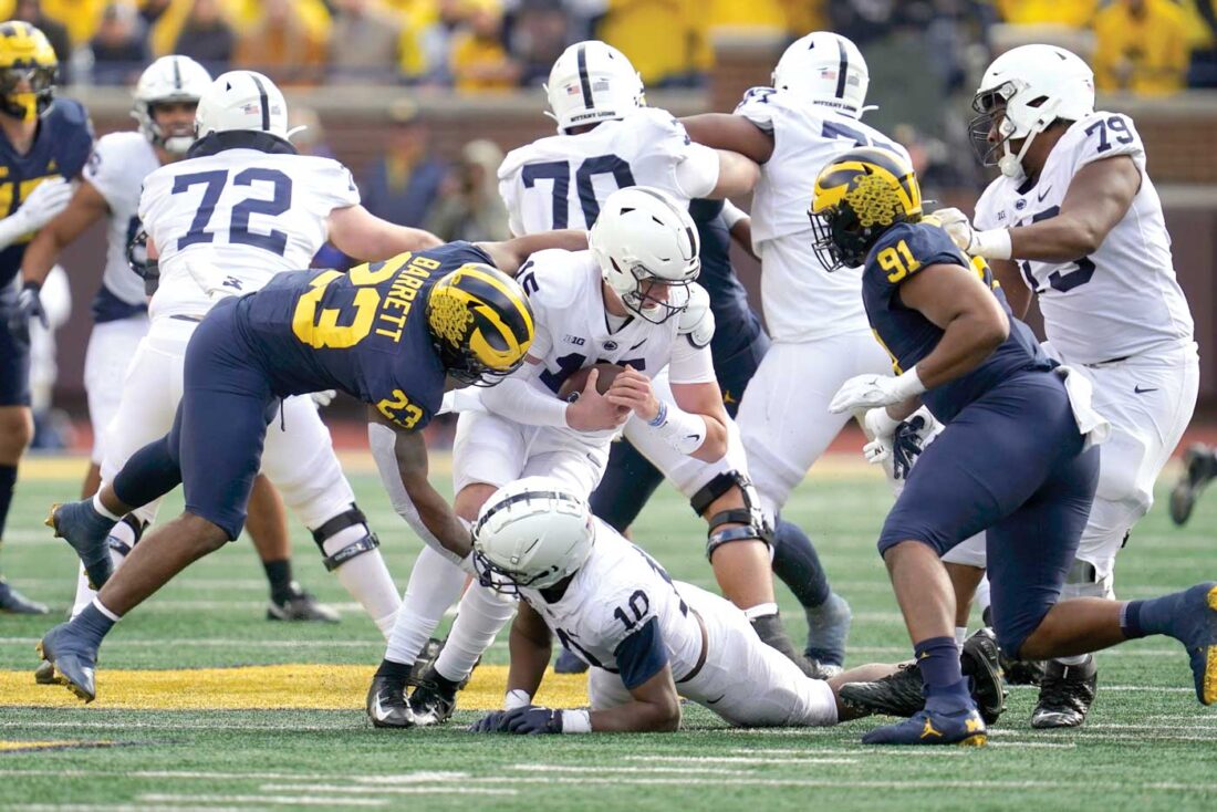 - Michigan linebacker Michael Barrett (23) sacks Penn State quarterback Drew Allar (15) in the second half of the Oct. 15 battle between the two Big Ten rivals in Ann Arbor, Mich. Currently, the Big Ten features some fo the top defensive units in all of college football. (Paul Sancya/AP photo)