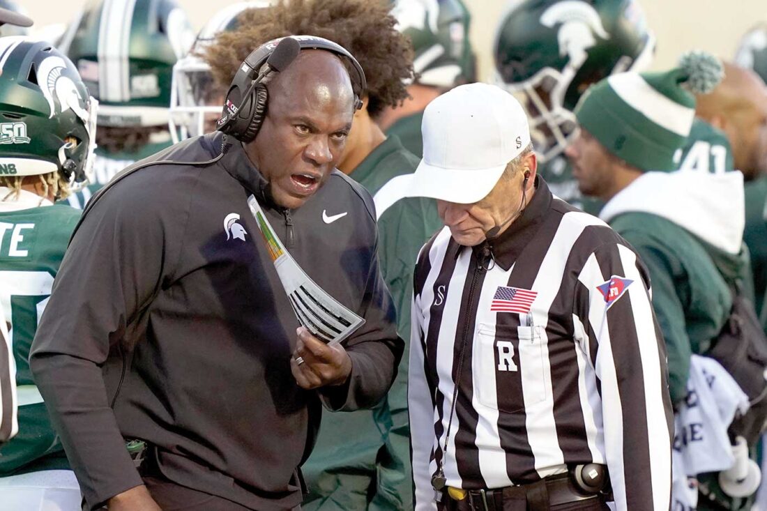 - Carlos Osorio/AP photo Michigan State coach Mel Tucker talks to the referee during the team’s game against Ohio State on Oct. 8. While the Spartans have struggled in 2022, a victory over their in-state rivals would give MSU fans a reason to celebrate.