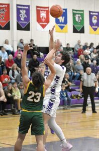Badger Edward Swanson (2) tries to get off a shot over Bobcat defender Logan Schuls (23) during the first half of Tuesday’s varsity contest. (Dennis Mansfield/Daily News photo)