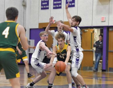 - Badger Edward Swanson (2) tries to get off a shot over Bobcat defender Logan Schuls (23) during the first half of Tuesday’s varsity contest. (Dennis Mansfield/Daily News photo)