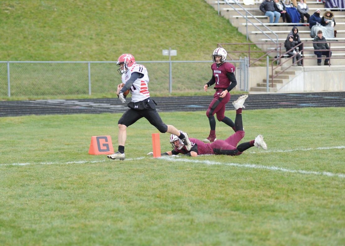 (Ben Murphy photo) North Central’s Luke Gorzinski finds the end zone after eluding defenders along the sideline during Saturday’s 36-12 Division 2 eight-player state semifinal game in Marion.
