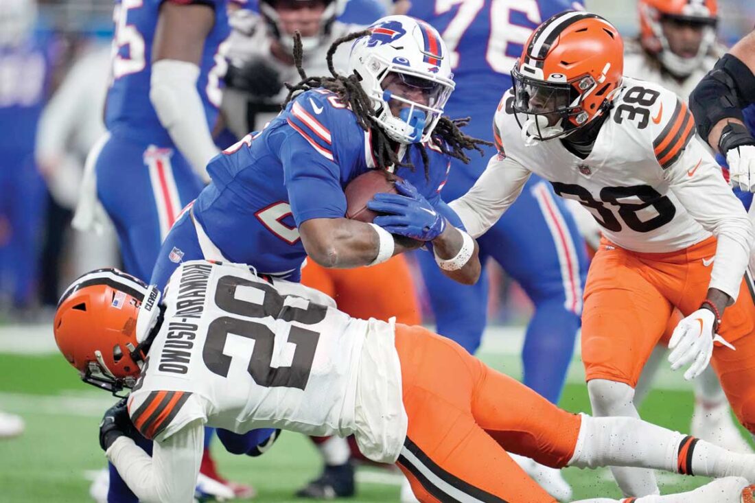 Buffalo Bills running back Devin Singletary (26) is tackled by Cleveland Browns cornerback A.J. Green, right, and linebacker Jeremiah Owusu-Koramoah during the second half of an NFL football game, Sunday, Nov. 20, 2022, in Detroit. (Paul Sancya/AP photo)
