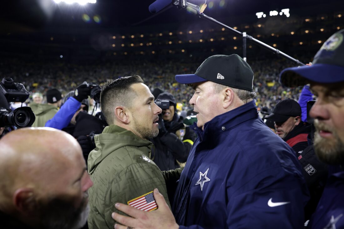 Green Bay Packers head coach Matt LaFleur, center left, and Dallas Cowboys head coach Mike McCarthy, center right, greet each other after the Packers 31-28 overtime win in an NFL football game Sunday, Nov. 13, 2022, in Green Bay, Wis. (AP Photo/Matt Ludtke)